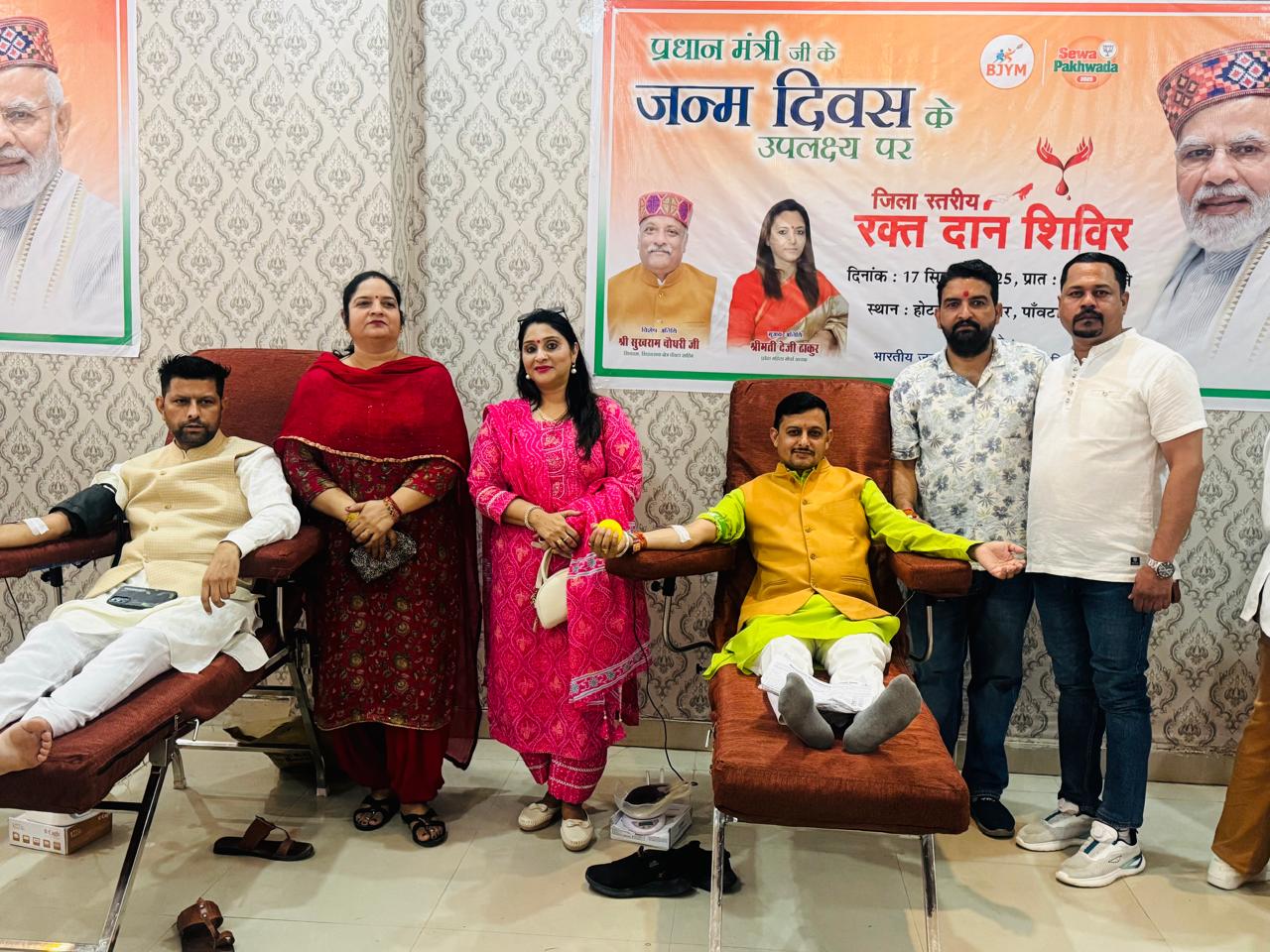 “इस अवसर पर पांवटा भाजपा युवा मोर्चा के अध्यक्ष चरणजीत चौधरी ने बताया कि पांवटा साहिब के चुंगी नंबर-6 स्थित रॉकवुड होटल में यह कार्यक्रम आयोजित किया जा रहा है। इसमें 150 यूनिट रक्तदान का लक्ष्य निर्धारित किया गया है, जिनमें से अब तक 100 से अधिक यूनिट रक्तदान हो चुका है। इस अवसर पर मंडल अध्यक्ष हितेंद्र कुमार धवन,रमेश तोमर, महामंत्री पवन चौधरी,रोहित चौधरी ,प्रदेश ओबीसी मोर्चा महामंत्री सुभाष चौधरी, जिला ओबीसी मोर्चा अध्यक्ष देवेन्द्र चौधरी,ओर ,जिला उपाध्यक्ष अनिल सैनी ,युवा मोर्चा अध्यक्ष चरणजीत सिंह चौधरी, महामंत्री तरनजीत सिंह गिल,सुनील चौधरी,अशोक कुमार, कुलदीप सैनी ,मीडिया प्रभारी सुखविंदर चौधरी,अविनाश झब्बा, संयम गुप्ता ,पवन पटियाल ,हितेंद्र कुमार,संदीप कुमार,ओर सभी भारतीय जनता पार्टी मंडल पांवटा साहिब के सम्मानित पदाधिकारी ओर सम्मानित कार्यकर्ता मौजूद रहे